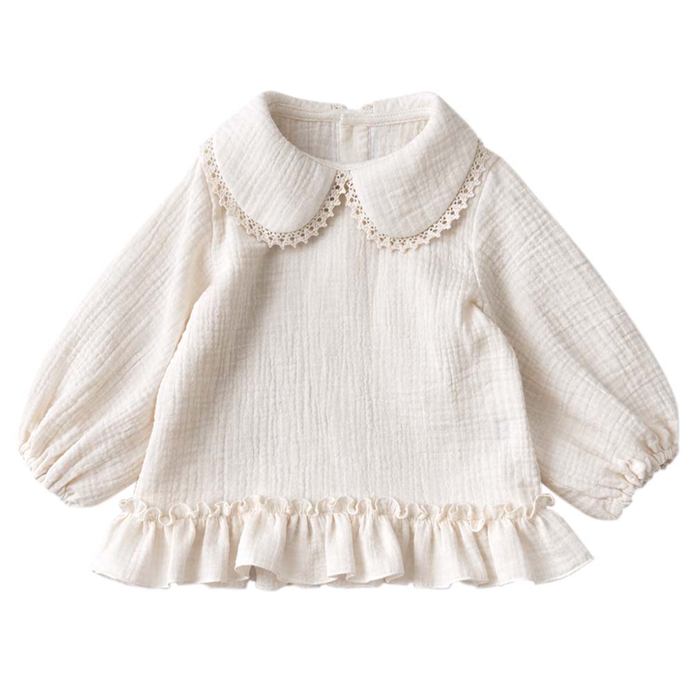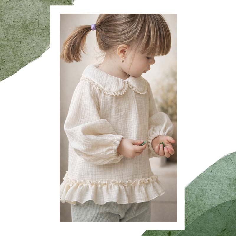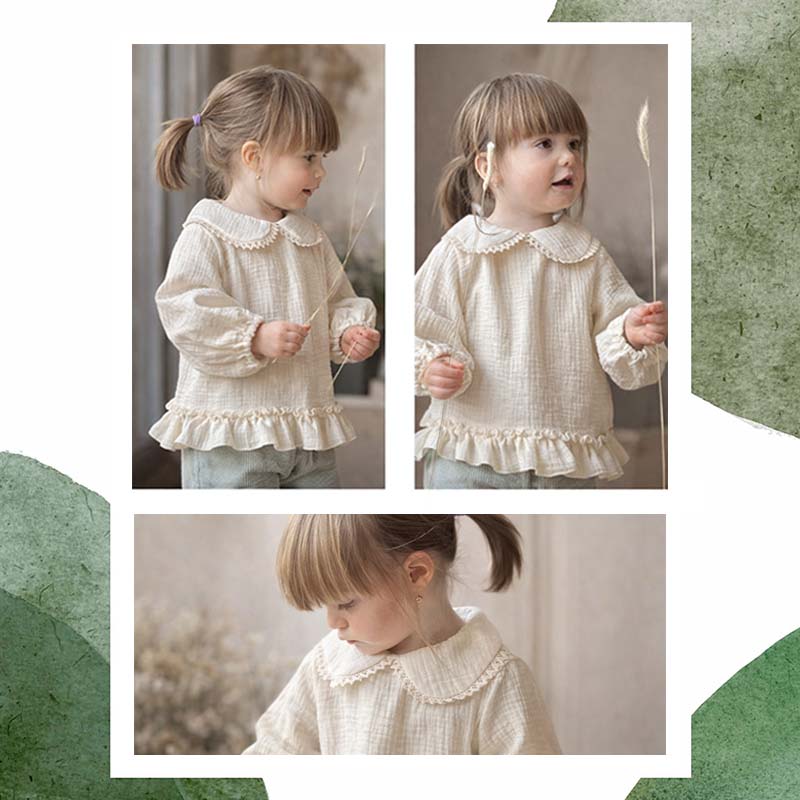 Bluză cu guler și dantelă în margine, din bumbac moale potrivit pentru pielea delicată a bebelușilor. Închidere la spate cu capse, mâneci bufante și croi lejer pentru a asigura confort deplin și libertate de mișcare.