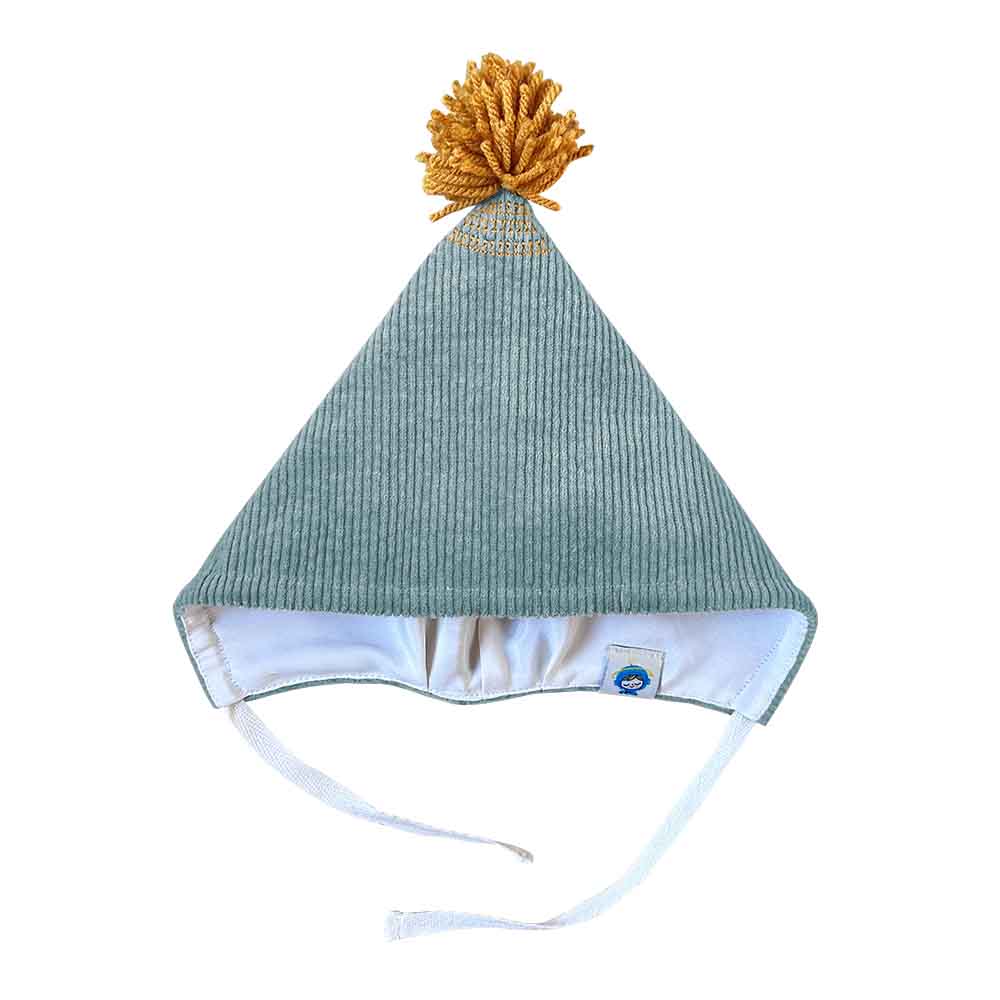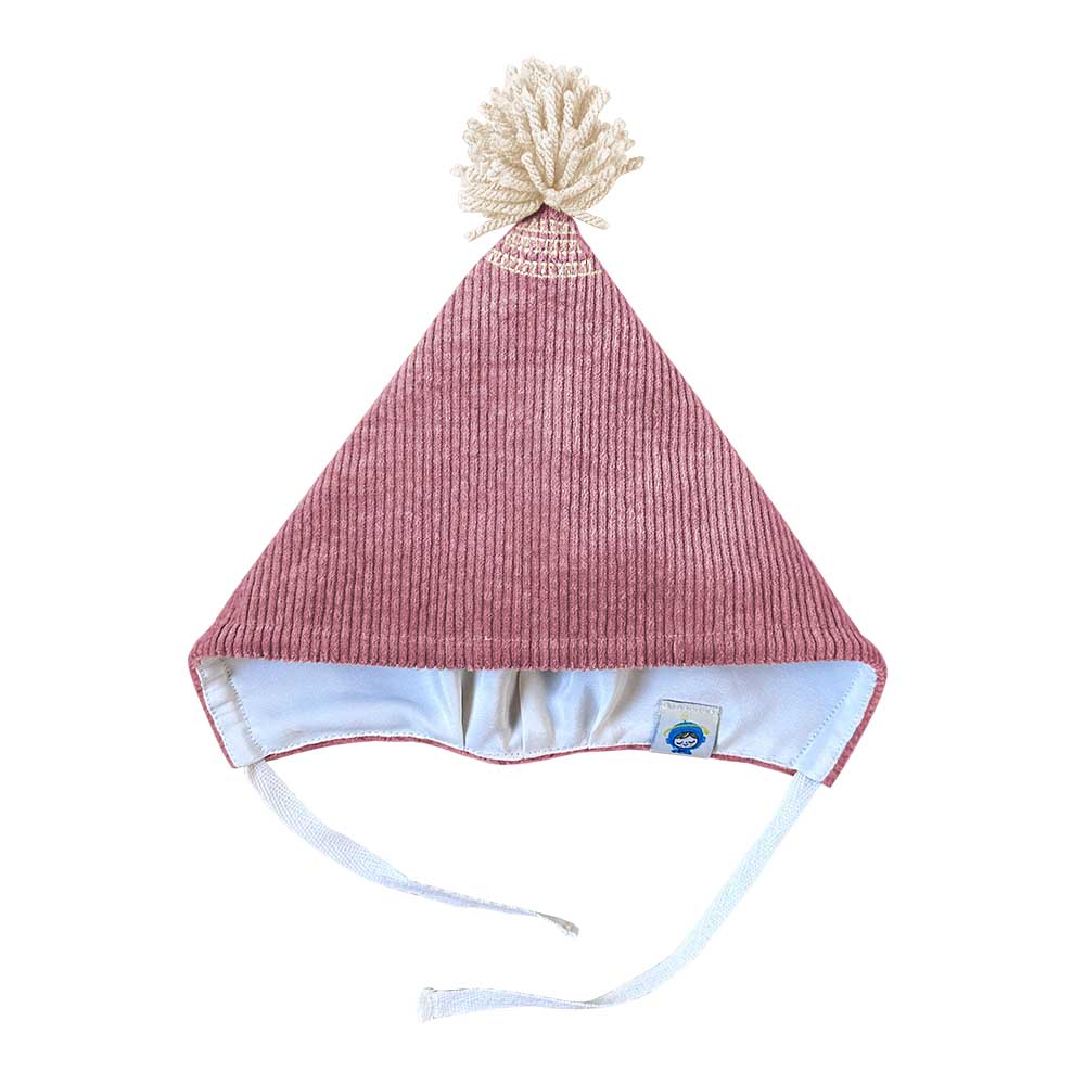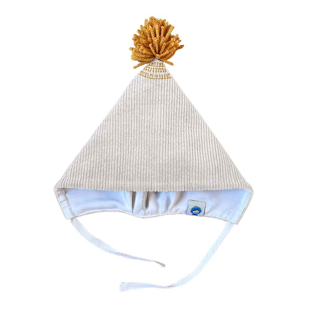 Căciulă cu pompon pufos în partea de sus, din țesătură moale de bumbac potrivită pentru pielea delicată a bebelușilor. Ajustabilă pe față cu ajutorul șnurului îngust.