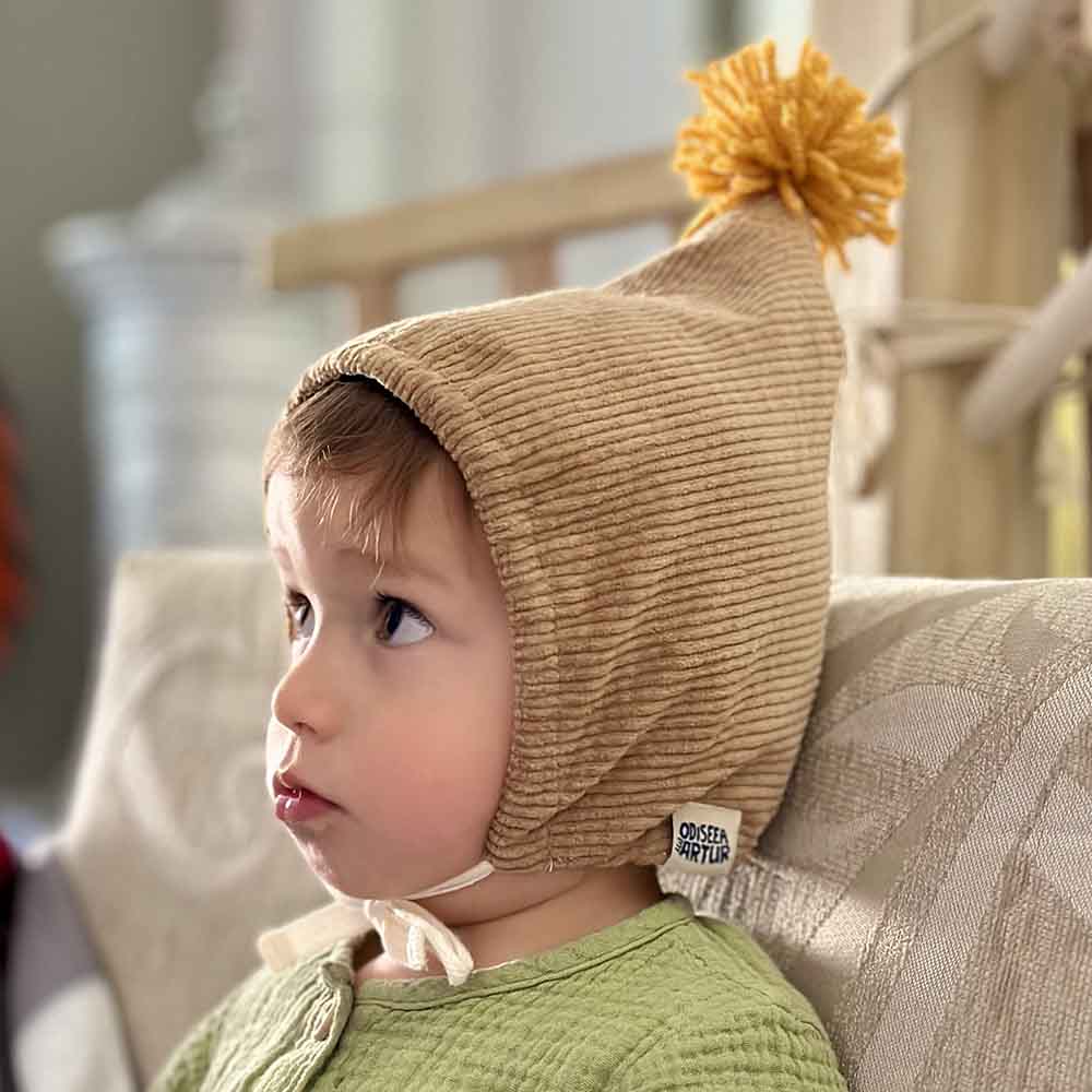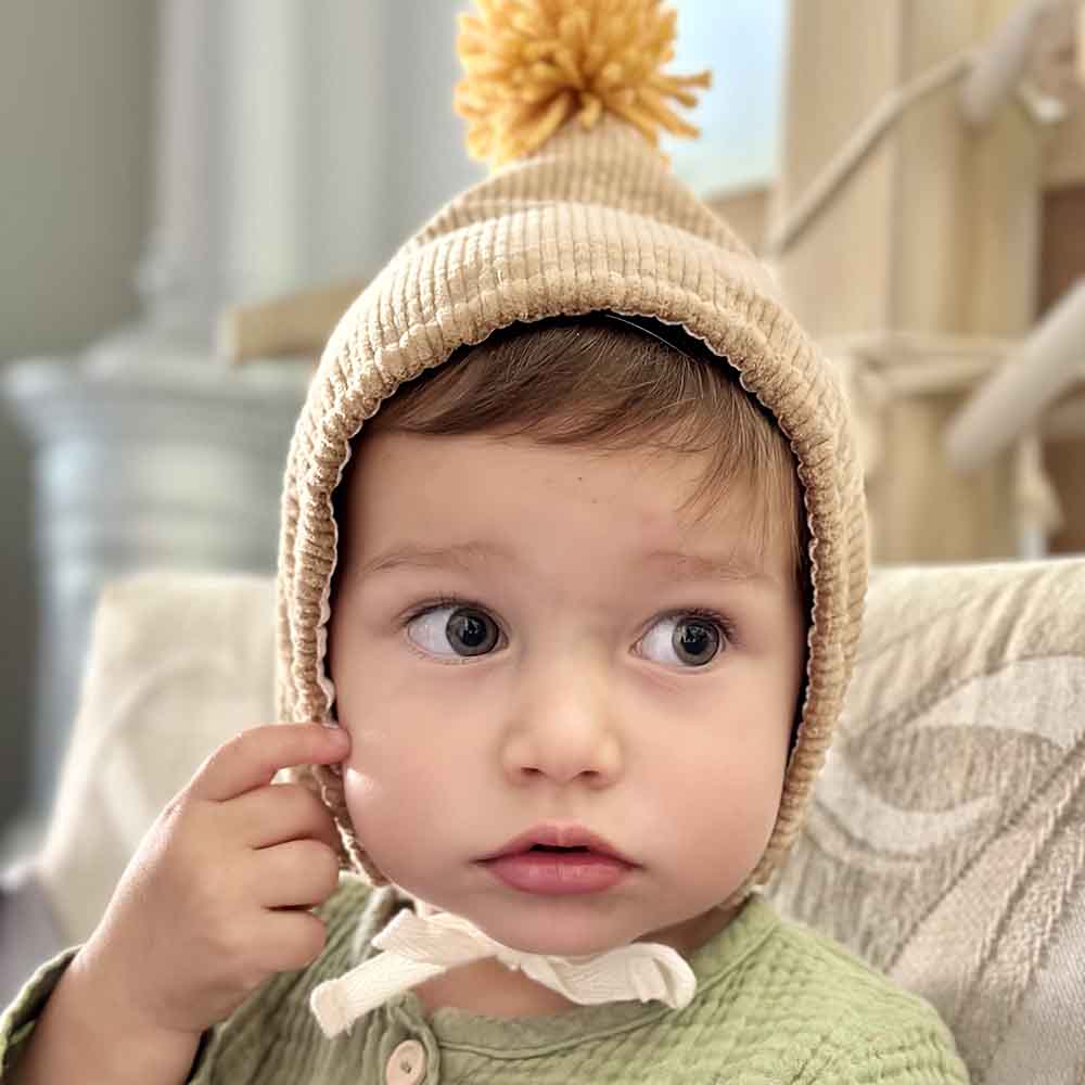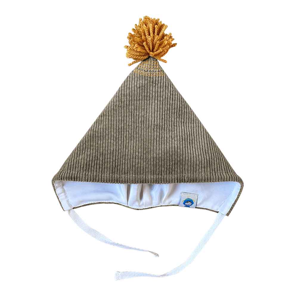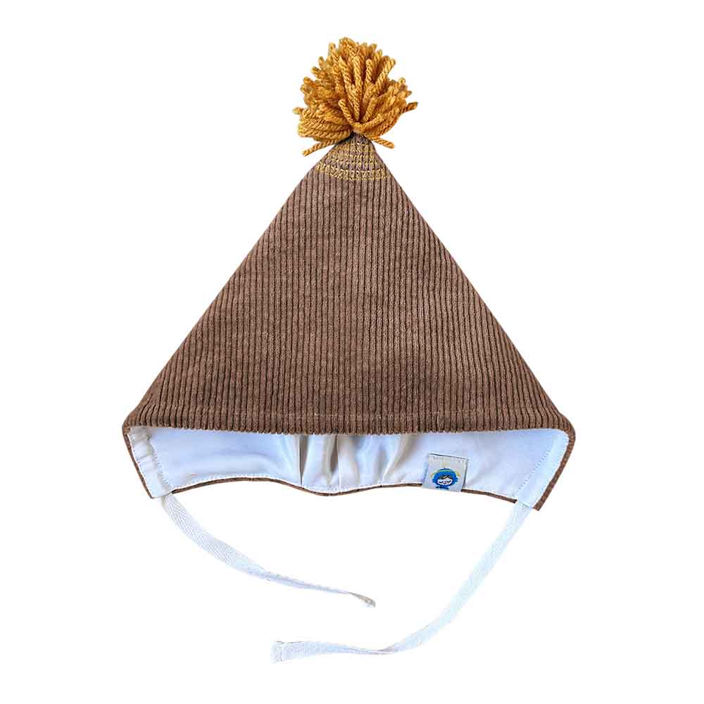 Căciulă cu pompon pufos în partea de sus, din țesătură moale de bumbac potrivită pentru pielea delicată a bebelușilor. Ajustabilă pe față cu ajutorul șnurului îngust.