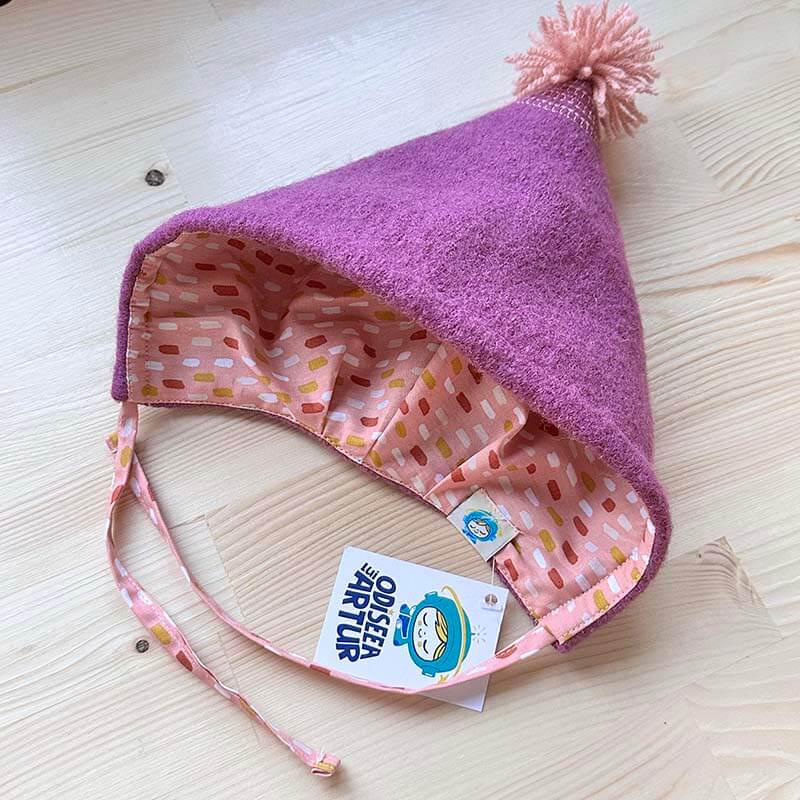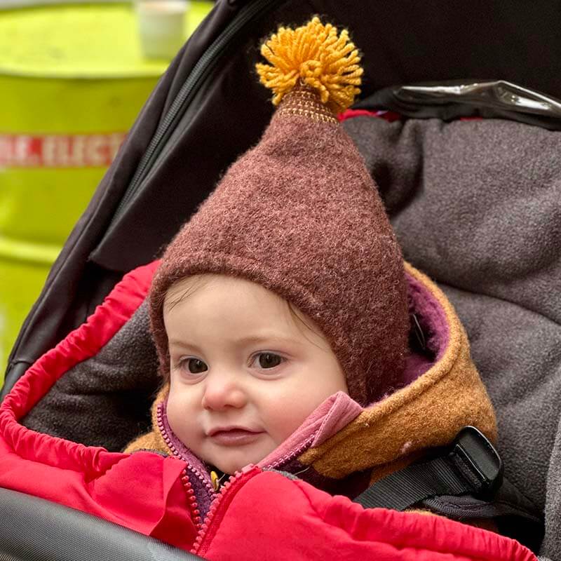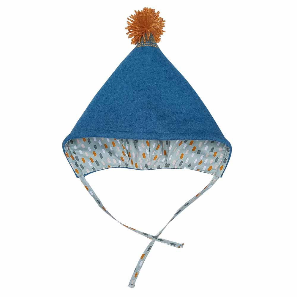 Căciulă cu pompon pufos în partea de sus, cu interior de țesătură moale de bumbac potrivită pentru pielea delicată a bebelușilor. Ajustabilă pe față cu ajutorul șnurului îngust. Căptușită cu bumbac certificat Oeko-Tex