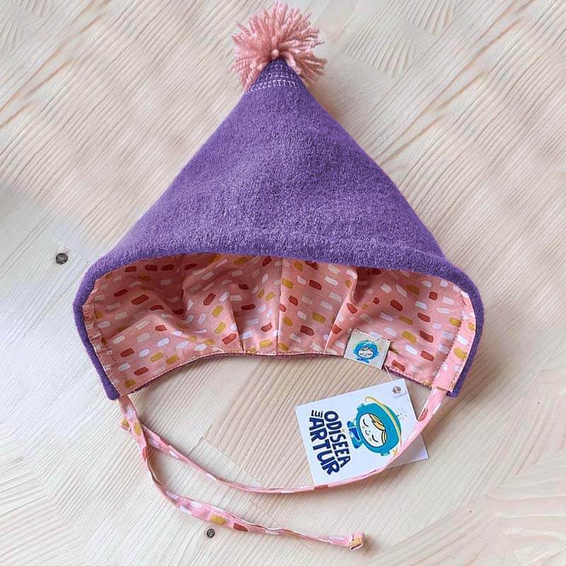 Căciulă cu pompon pufos în partea de sus, cu interior de țesătură moale de bumbac potrivită pentru pielea delicată a bebelușilor. Ajustabilă pe față cu ajutorul șnurului îngust. Căptușită cu bumbac certificat Oeko-Tex sau lână merinos extrafină (sheep friendly, mulesing free).