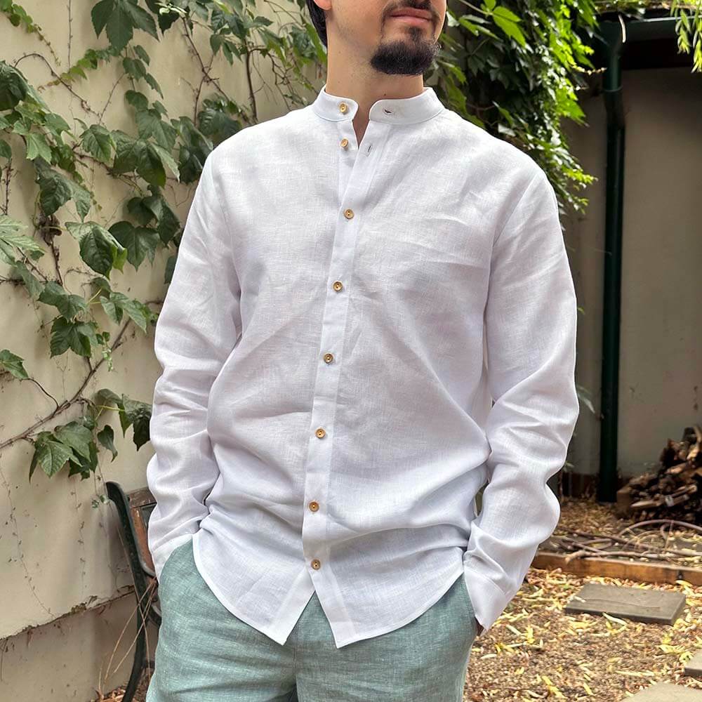 Cămașă din in, croi regular fit, cu nasturi de lemn în față și platcă la spate.