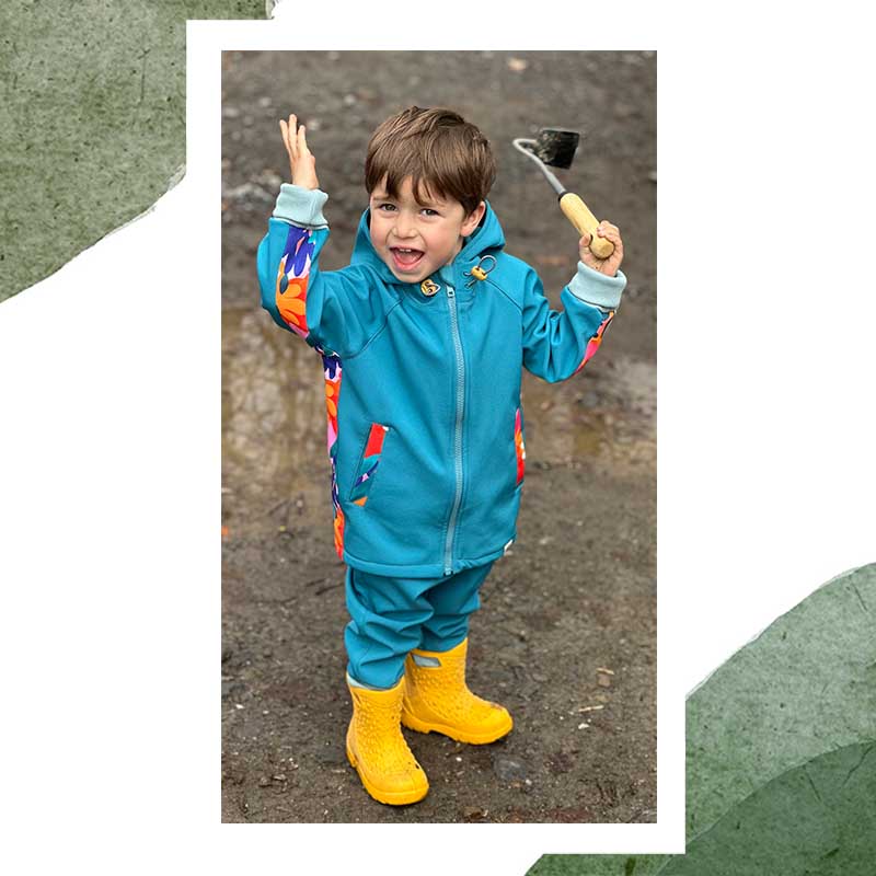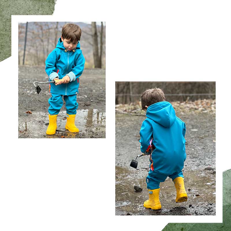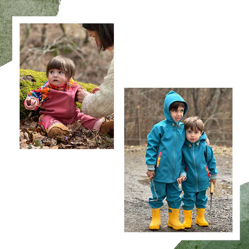 Softshell - stratul interior este fleece moale și călduros, stratul exteriorul are o impermeabilitate de 12.000 mm coloană de apă. Îi ține pe copii uscați și în siguranță împotriva umezelii, în plus, permite pielii să respire, asigurând confortul în timp ce se joacă în aer liber. Diferă de pelerinele de ploaie, care, deși impermeabile, nu oferă aceeași ventilație și confort copiilor.