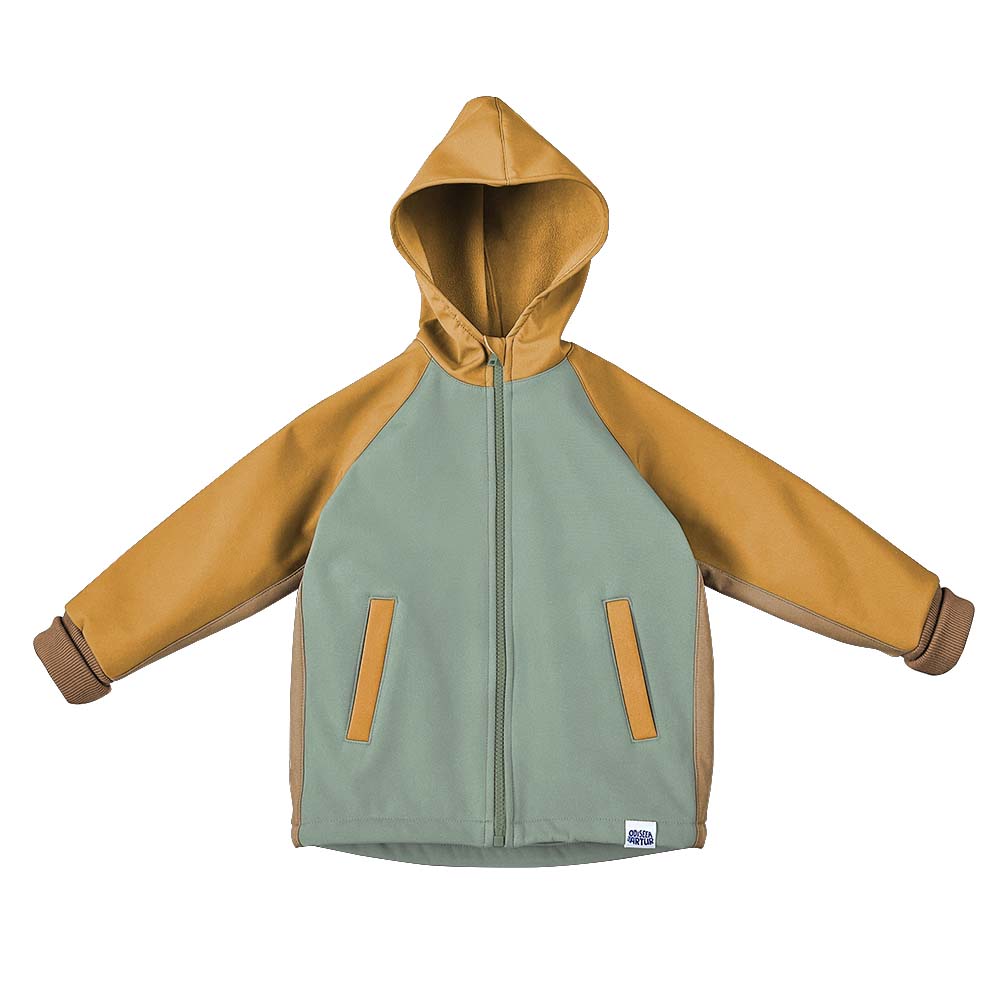 Softshell - stratul interior este fleece moale și călduros, stratul exteriorul are o impermeabilitate de 12.000 mm coloană de apă. Îi ține pe copii uscați și în siguranță împotriva umezelii, în plus, permite pielii să respire, asigurând confortul în timp ce se joacă în aer liber. Diferă de pelerinele de ploaie, care, deși impermeabile, nu oferă aceeași ventilație și confort copiilor.