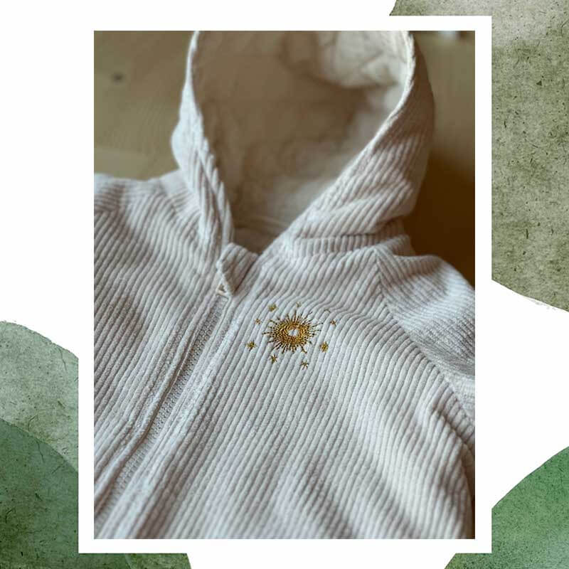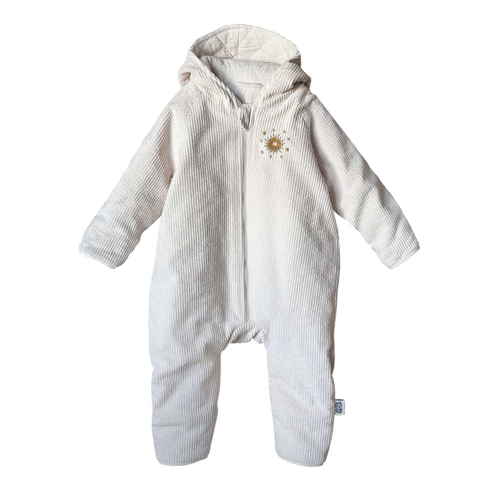 Overall tip salopetă din bumbac reiat cu glugă, fermoar și broderie în față. Manșete și botoșei reversibile pentru a ține de cald la mâini și la picioare.