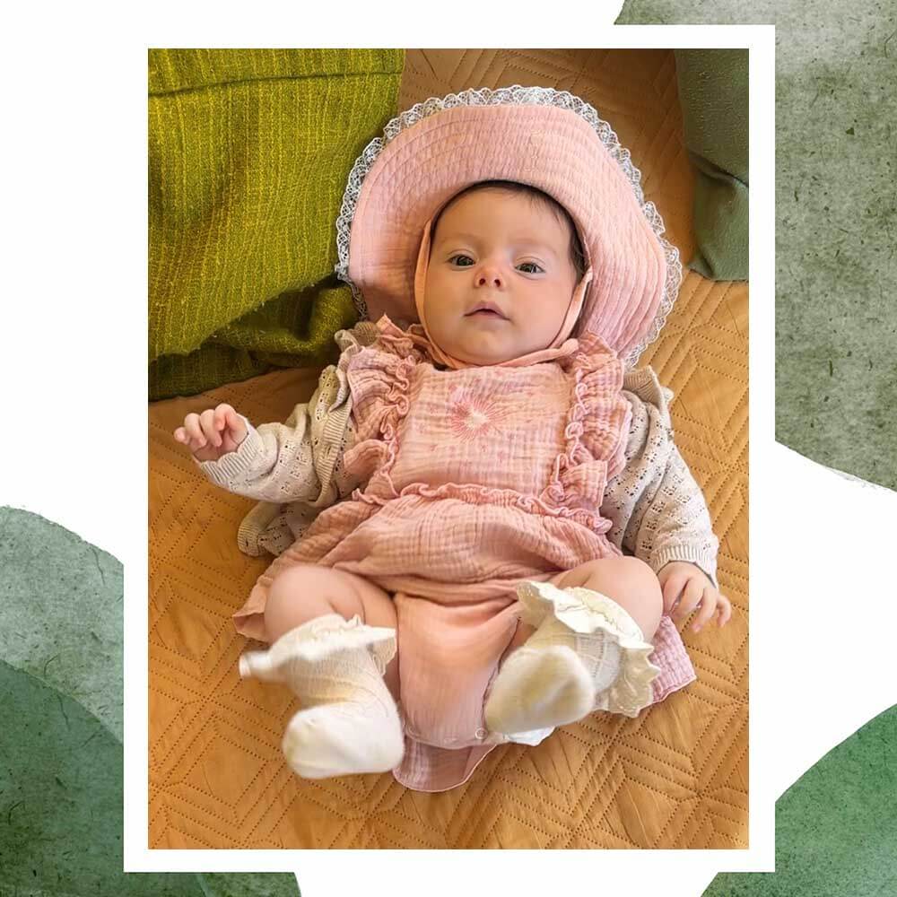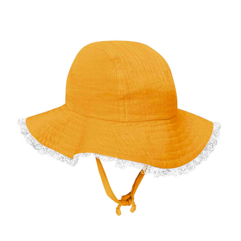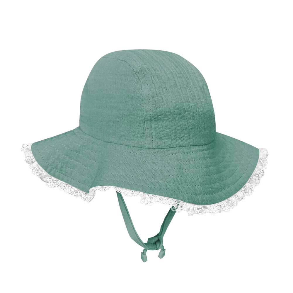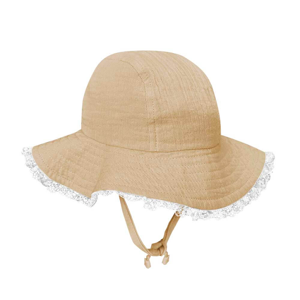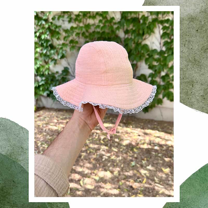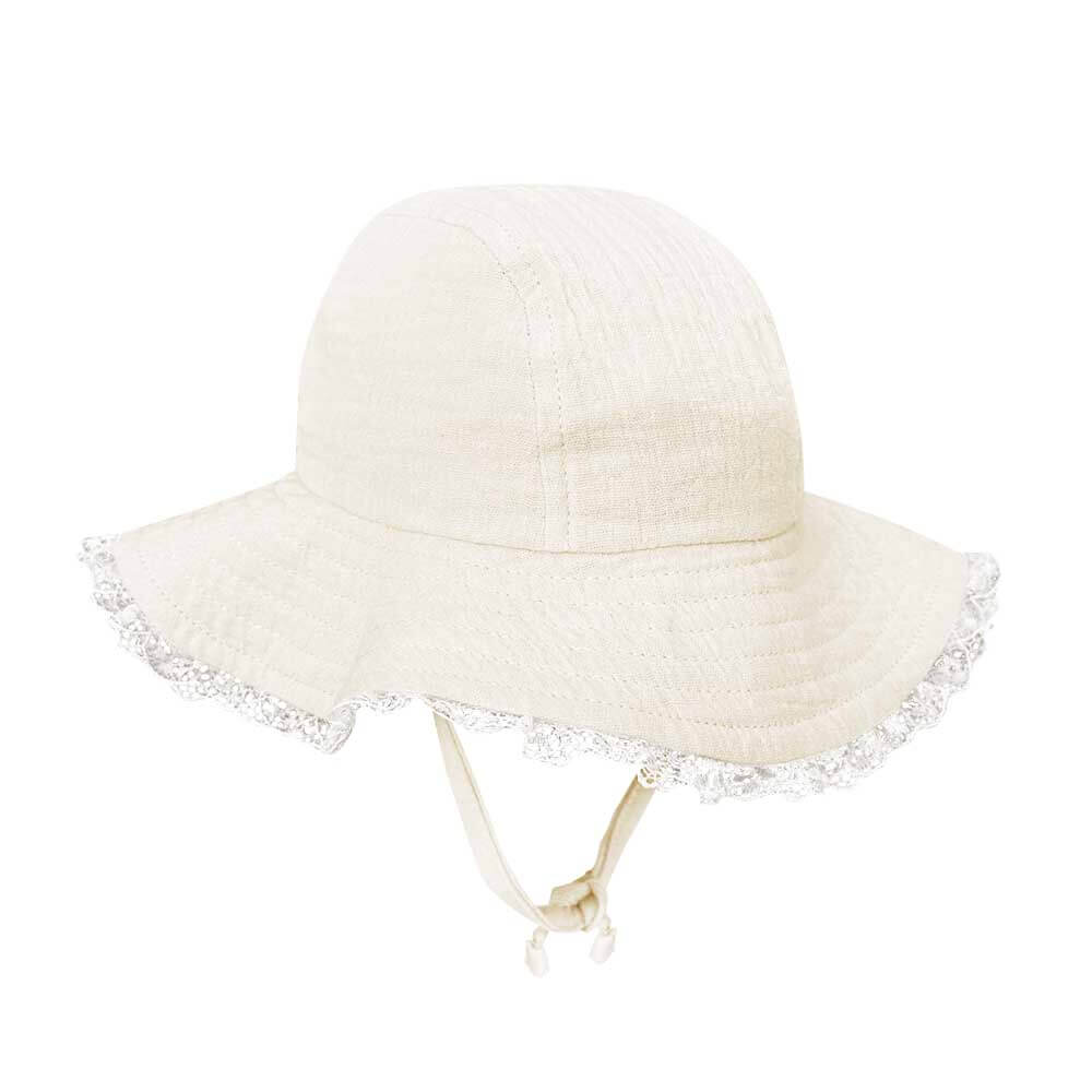 Pălărie de soare dinmuselină moale de bumbac potrivită pentru pielea delicată a bebelușilor. Prevăzută cu dantelă pe margine, șnururi sub bărbie și bandă împotriva transpirației.