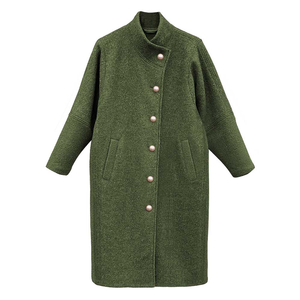 Palton lung cu croială lejeră, cu guler înalt și nasturi în față.