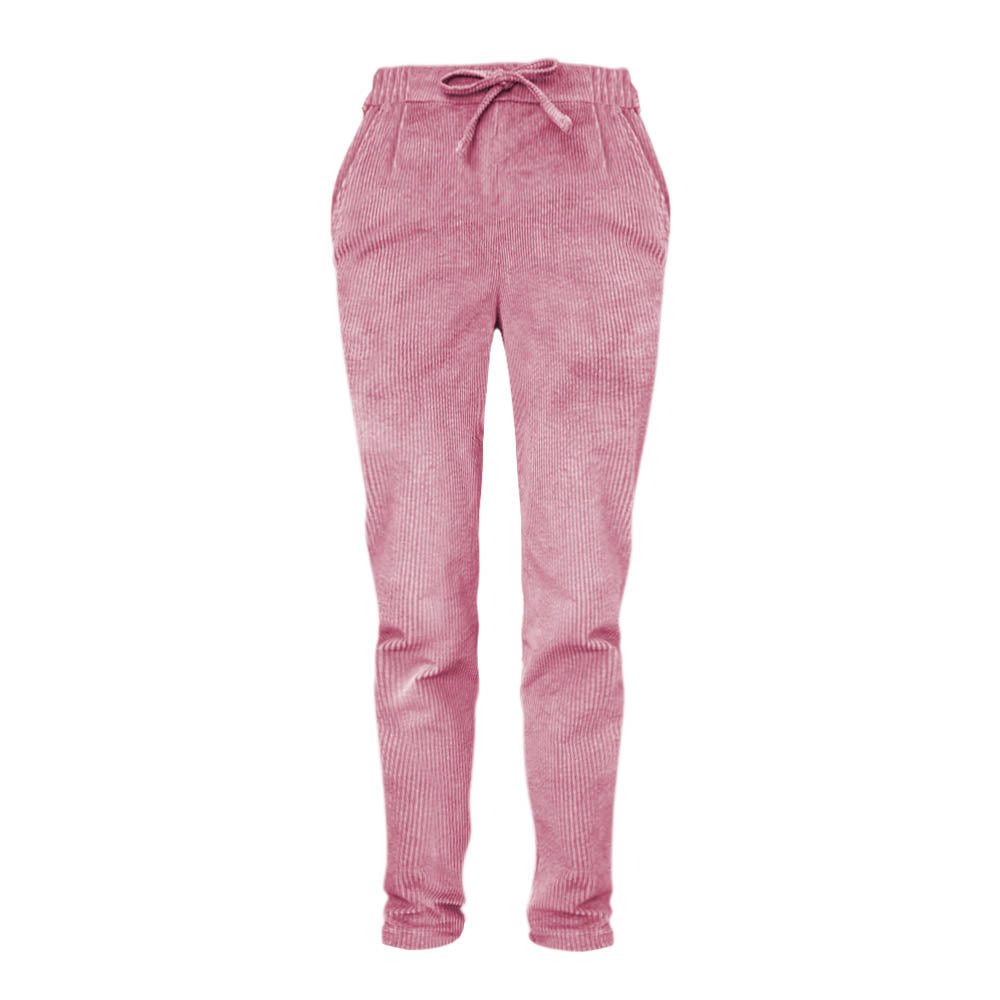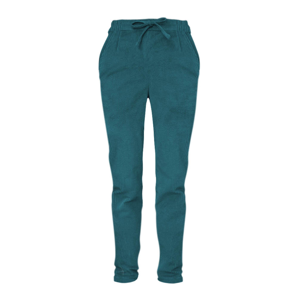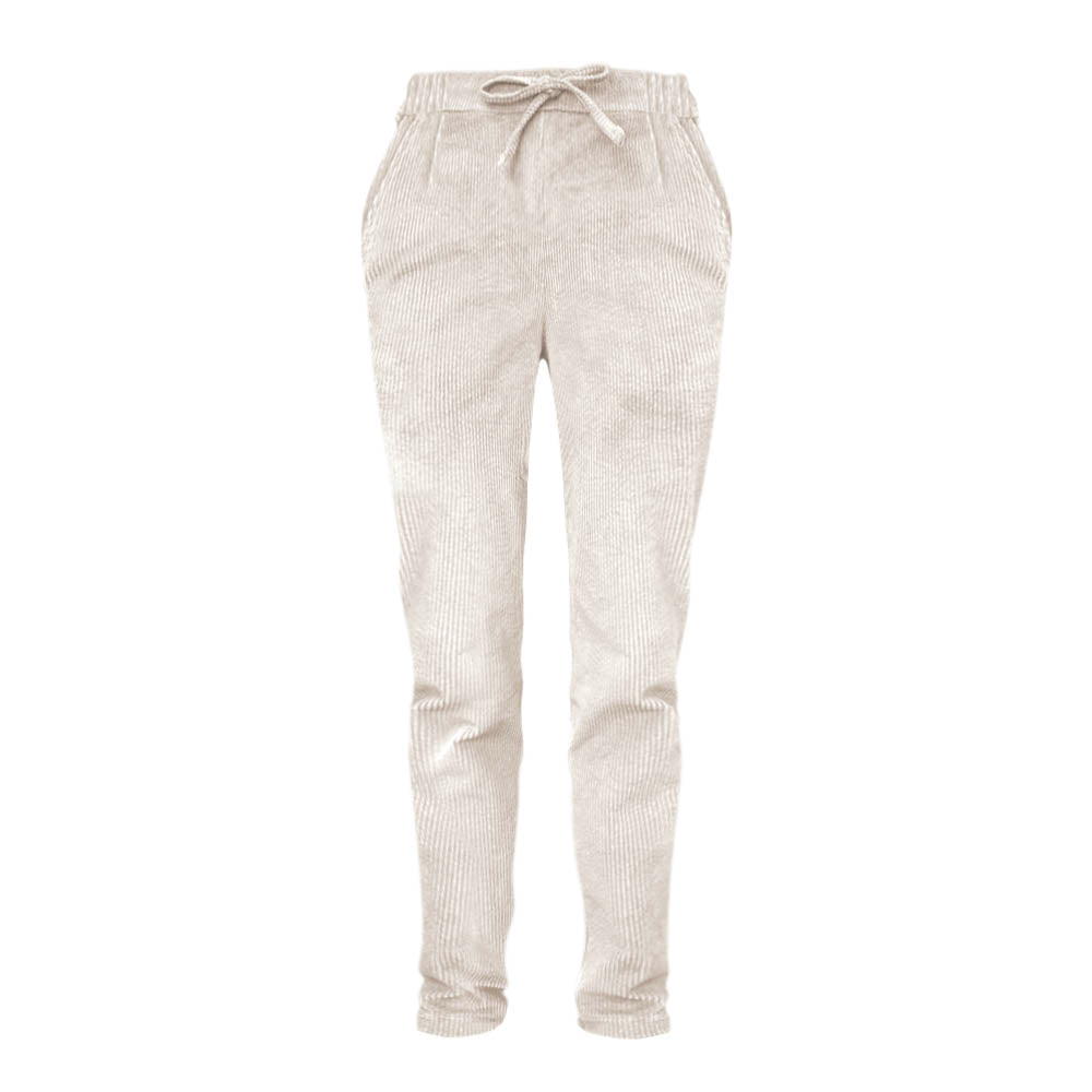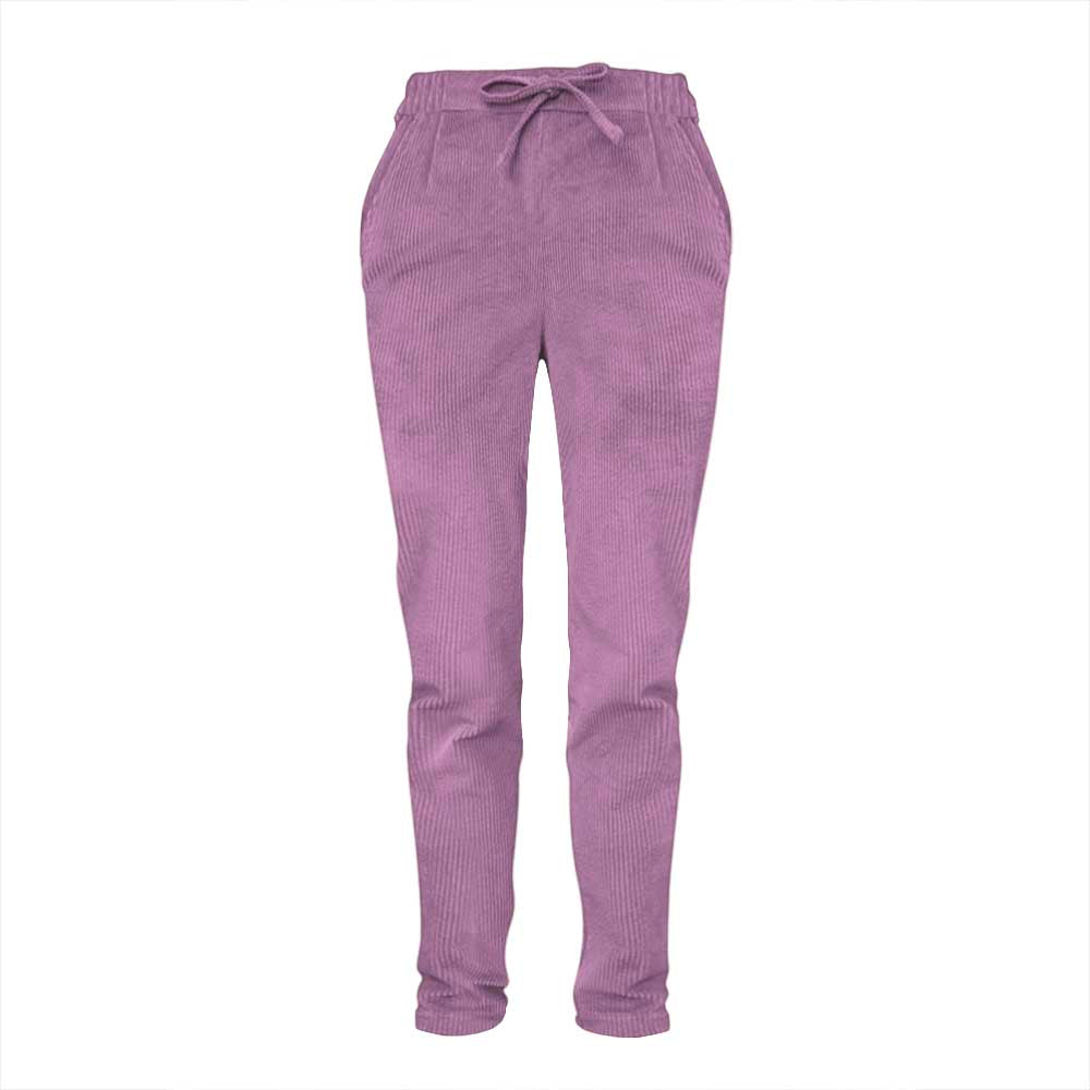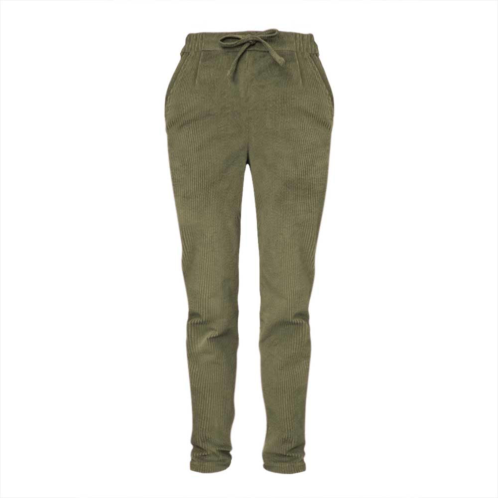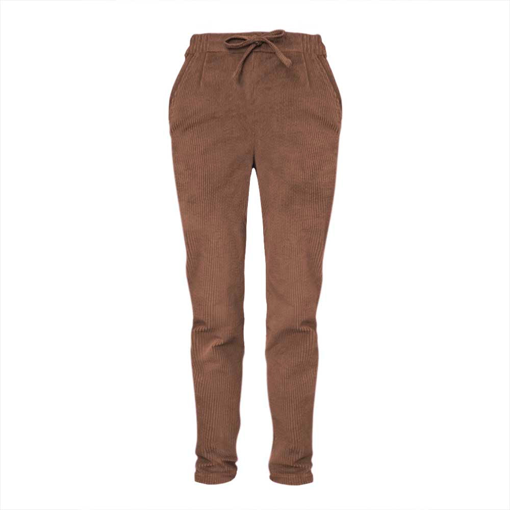 Pantaloni din bumbac reiat strech, cu buzunare și falduri în partea din față și pensă în spate. Are elastic în părțile laterale pentru a asigura o potrivire confortabilă fără a adăuga volum în zona abdomenului.
