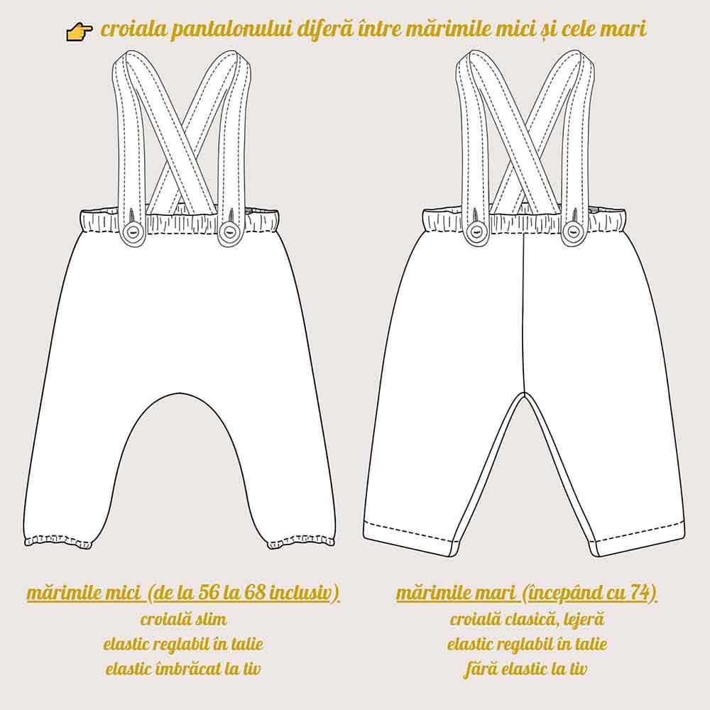 Am folosit muselină moale de bumbac potrivită pentru pielea delicată a bebelușilor și am ales un model cu croi lejer pentru a asigura confortul deplin și libertate de mișcare (croiul pantalonului diferă între mărimile mici și cele mari). Pantalonul Nemo este perfect pentru a crea o ținută elegantă și rafinată, cu aspect modern și aparte, potrivit pentru astfel de ocazii speciale.