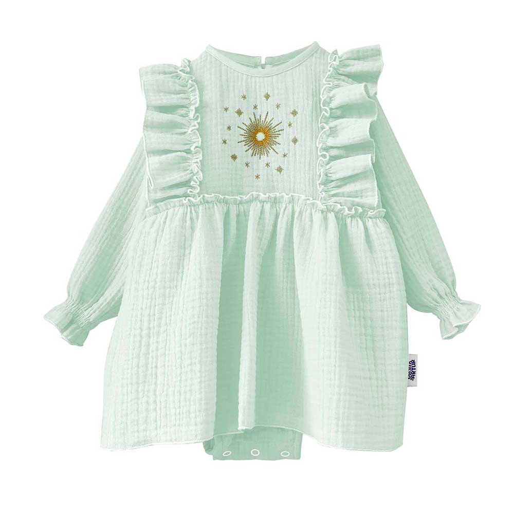 Steluțele brodate pe mijlocul feței adaugă o notă de farmec și stil, rochia fiind perfectă pentru ocazii speciale precum botez, aniversări sau ședințe foto. Acest detaliu ce se regăsește în colecțiile noastre îl asociem cu lumea vastă și neexplorată a spațiului cosmic, evocând o dorință de a descoperi și de a explora necunoscutul, dorință pe care bebelușii și copiii curioși o au deja și care își dezvoltă simțurile și abilitățile prin intermediul experiențelor și aventurilor pe care le au în lumea lor în continuă schimbare și dezvoltare.