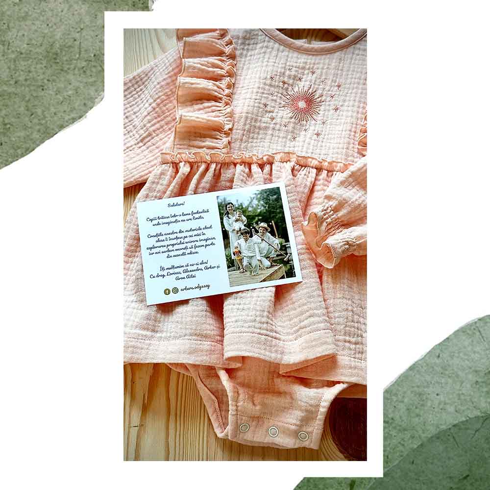 Modelul nostru Ad Astra este realizat din muselină moale și ușoară, ideală pentru a fi purtată în timpul zilelor calde de vară. Mărimile mici (56-92) au inclus body cu capse între picioare care acoperă delicat chiloțelul / scutecul, astfel nu trebuie să-ți faci griji că va rămâne cu spatele gol.