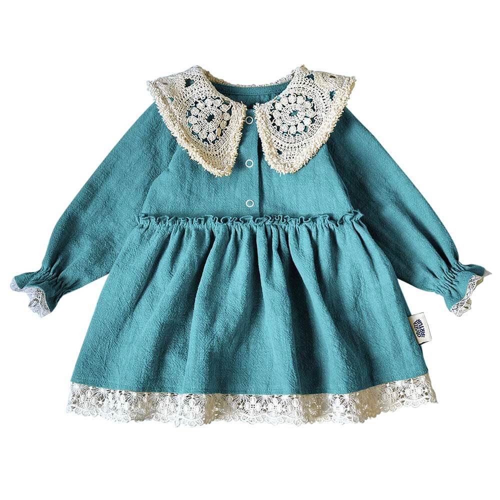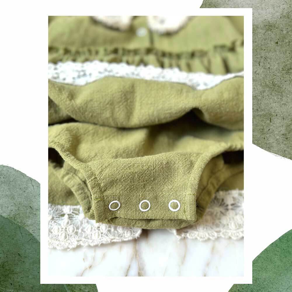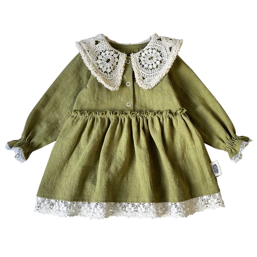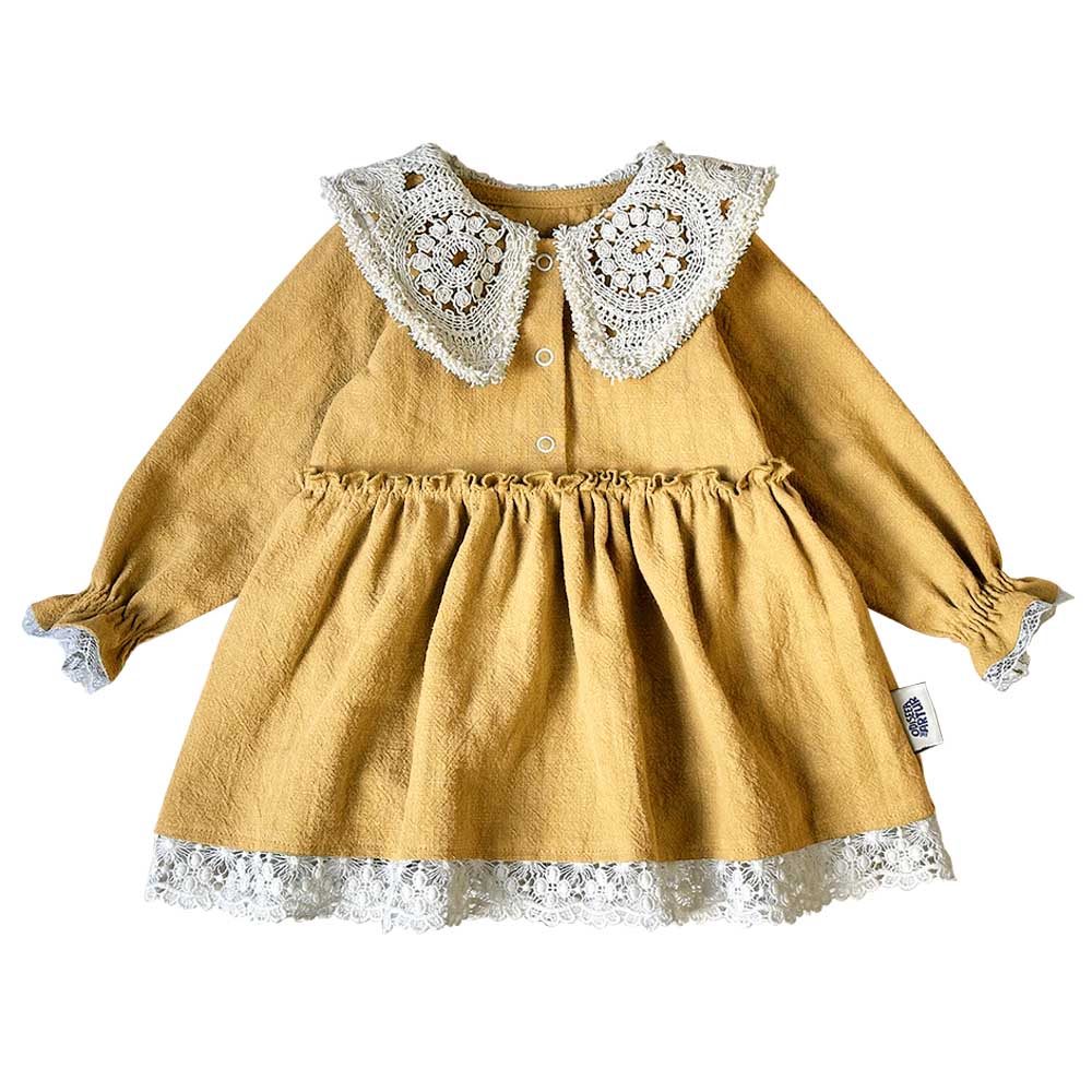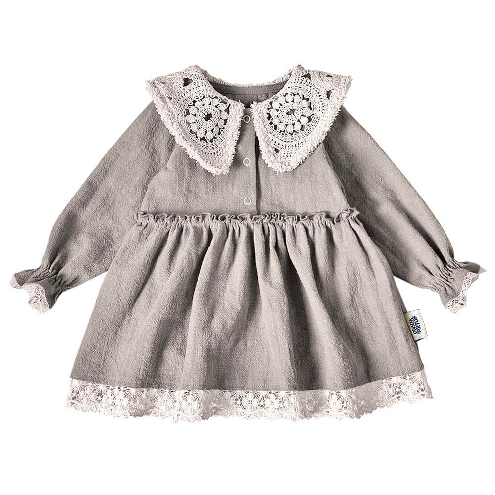 Rochie cu guler macrame și elastic la manșete, din țesătură de in. Mărimile mici (56-92) au inclus body cu capse între picioare care acoperă delicat chiloțelul / scutecul, astfel nu trebuie să-ți faci griji că va rămâne cu spatele gol.