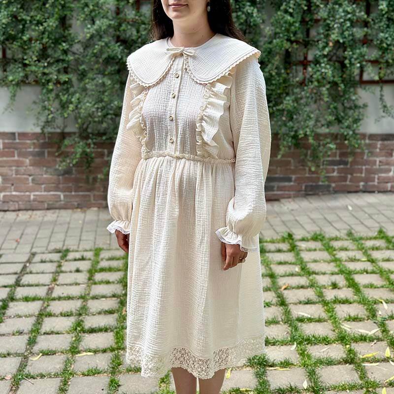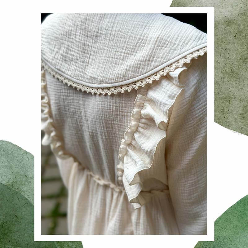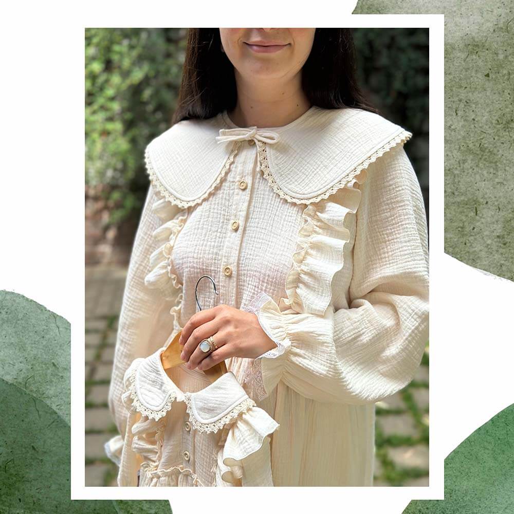 Rochie confortabilă din muselină vaporoasă, perfectă atât pentru petreceri, cât și pentru purtat de zi cu zi. Guler detașabil, accesorizat cu dantelă. Deschidere cu nasturi în față pentru alăptare ușoară, elastic îngust în talie. Buzunare ascunse în lateral pentru un plus de funcționalitate. Mâneci bufante lungi cu elastic îngust la manșete și dantelă. Rochia poate fi purtată atât în timpul sarcinii, cât și după.