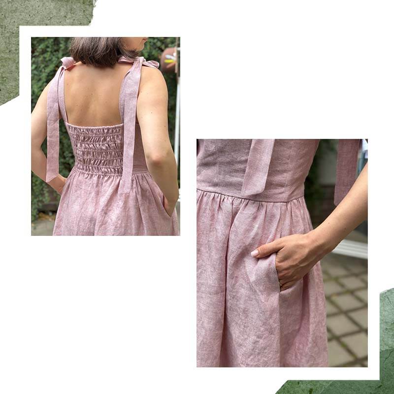Rochie lejeră din in 100% – un material natural, răcoros și ideal pentru zilele calde. Croiala midi cu fustă amplă oferă libertate de mișcare. Bretelele late se leagă în funde pe umeri, permițând ajustarea lungimii. Deschidere cu nasturi în partea din față (2 variante de decolteu), cu buzunare laterale ascunse – detaliu practic și elegant.