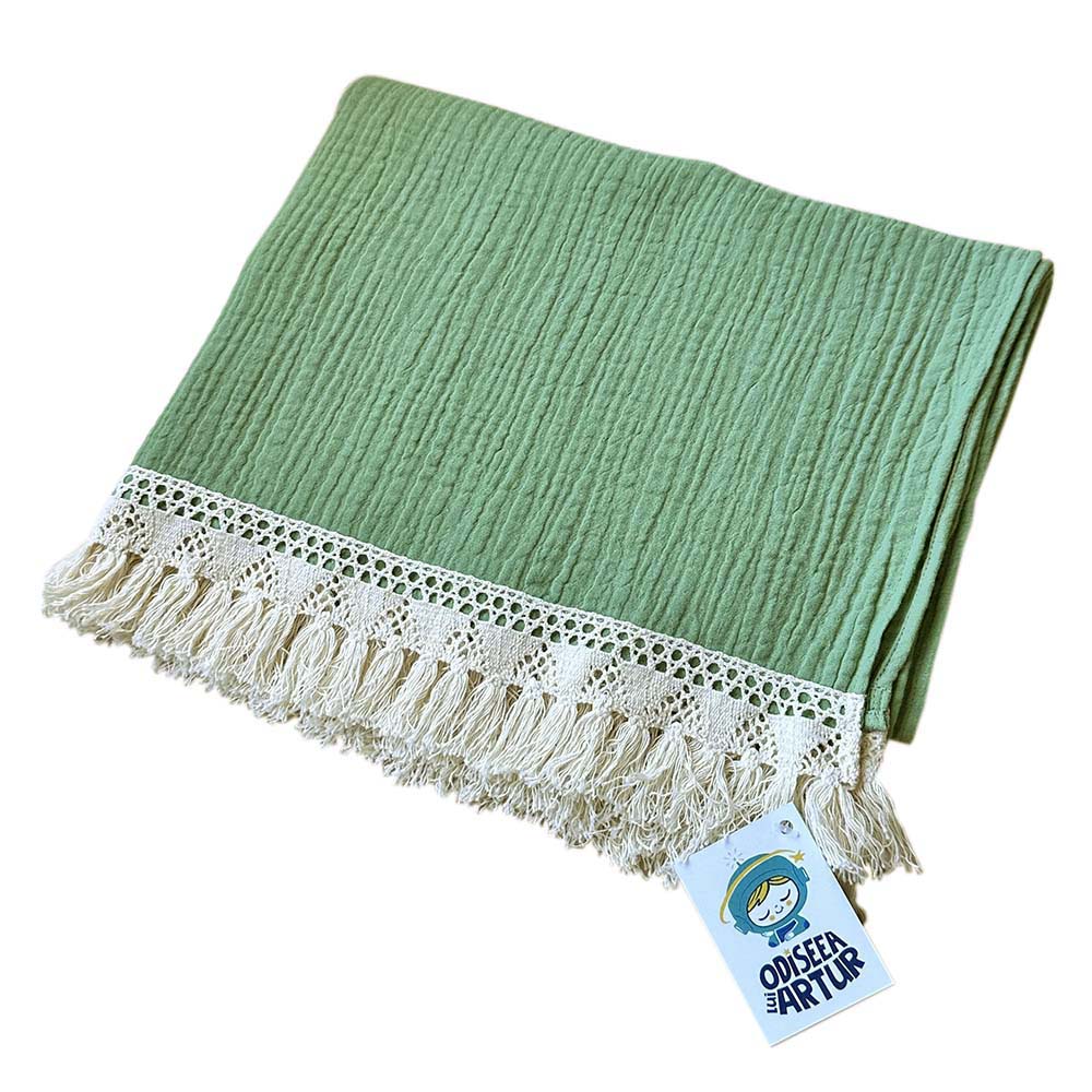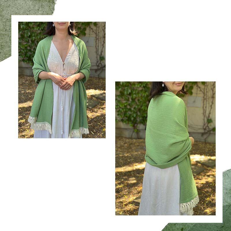 Un șal ușor și generos, croit din muselină de bumbac 100%, cu margini finisate cu dantelă delicată, care adaugă un aer discret romantic, fără să fie pretențios. Măsoară 200x60 cm – suficient cât să-l porți lejer peste umeri, fie pentru un strop de căldură în serile mai răcoroase, fie pentru un plus de protecție solară.