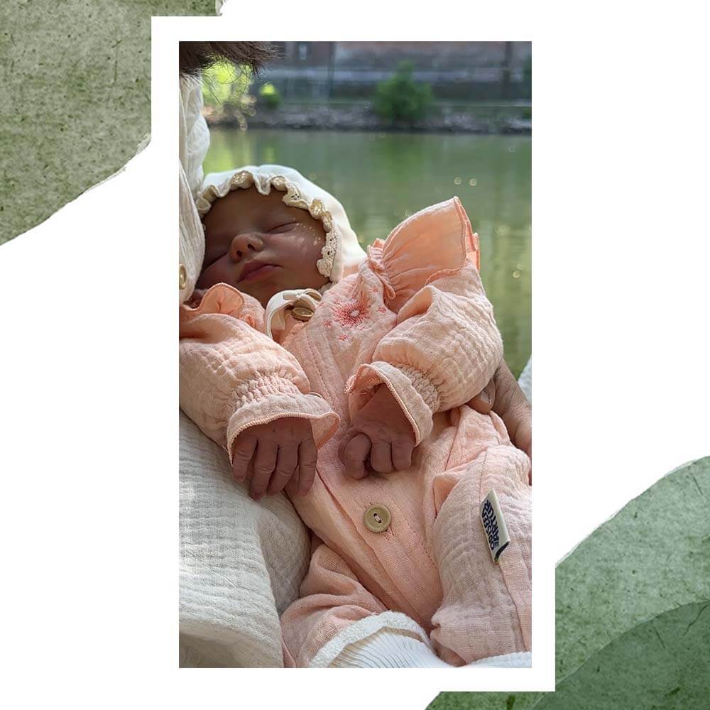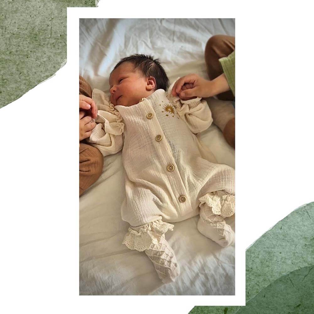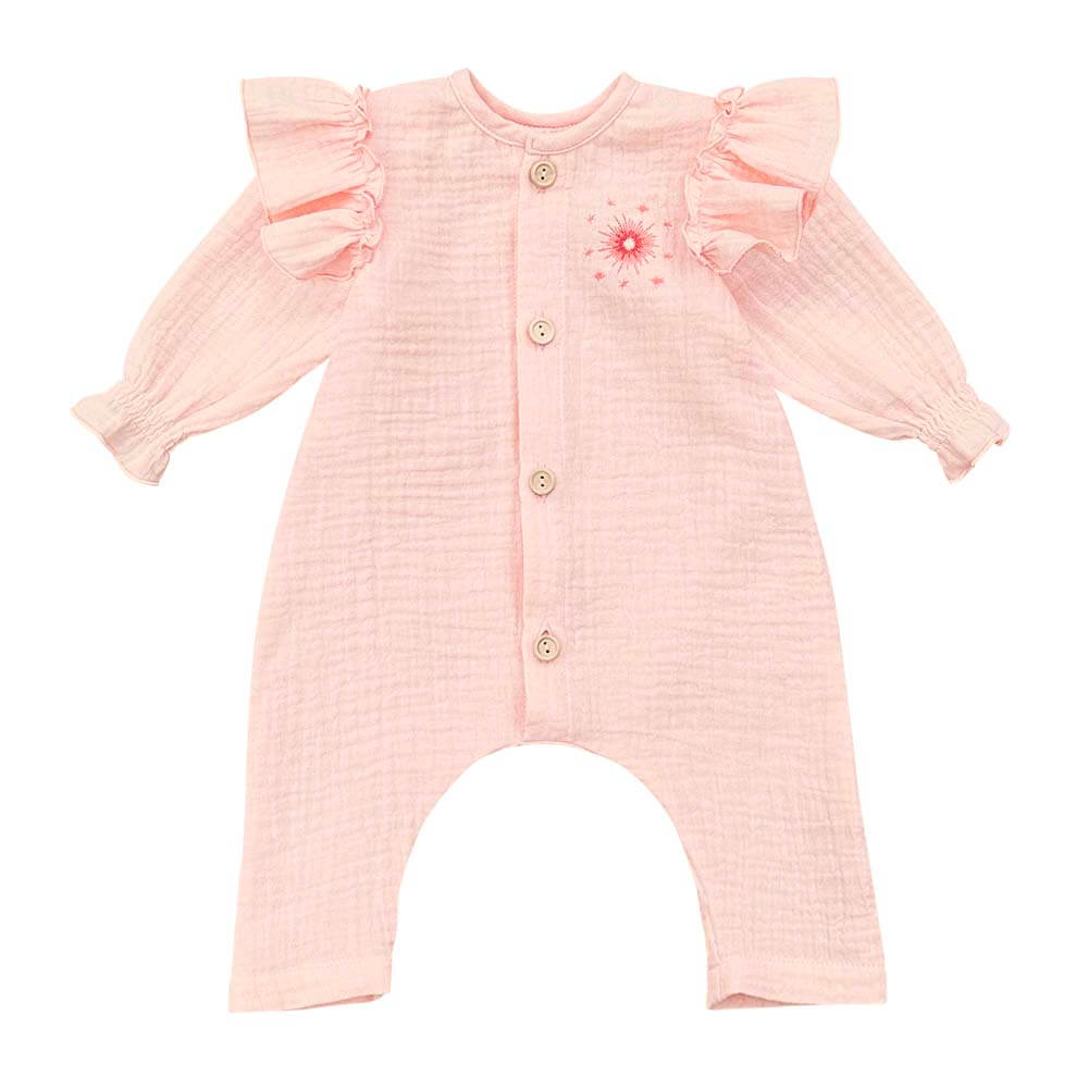 Salopetă pentru bebeluși și copii, din muselină moale de bumbac, cu volănașe la umeri, broderie și nasturi de lemn în față, perfectă pentru joacă în zilele cu soare.