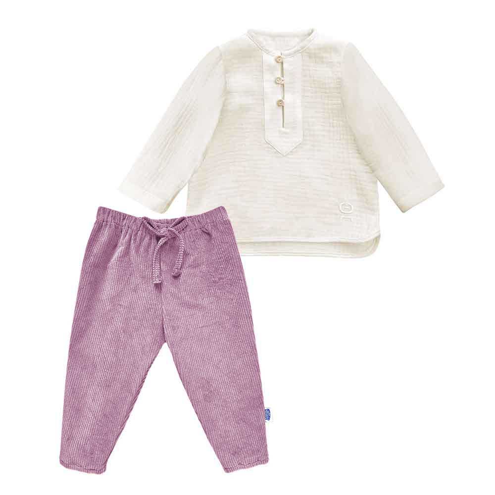 Set comod format din cămașă din muselină cu croiul lejer și pantaloni din bumbac reiat. Cămașă cu mânecă lungă, cu decolteu rotund și nasturi de lemn, mai scurtă în față și lungă la spate. Pantaloni lungi cu șnur decorativ și elastic reglabil îmbrăcat în talie. Pantalonul este din bumbac elastic, oferind un nivel suplimentar de confort și libertate de mișcare.