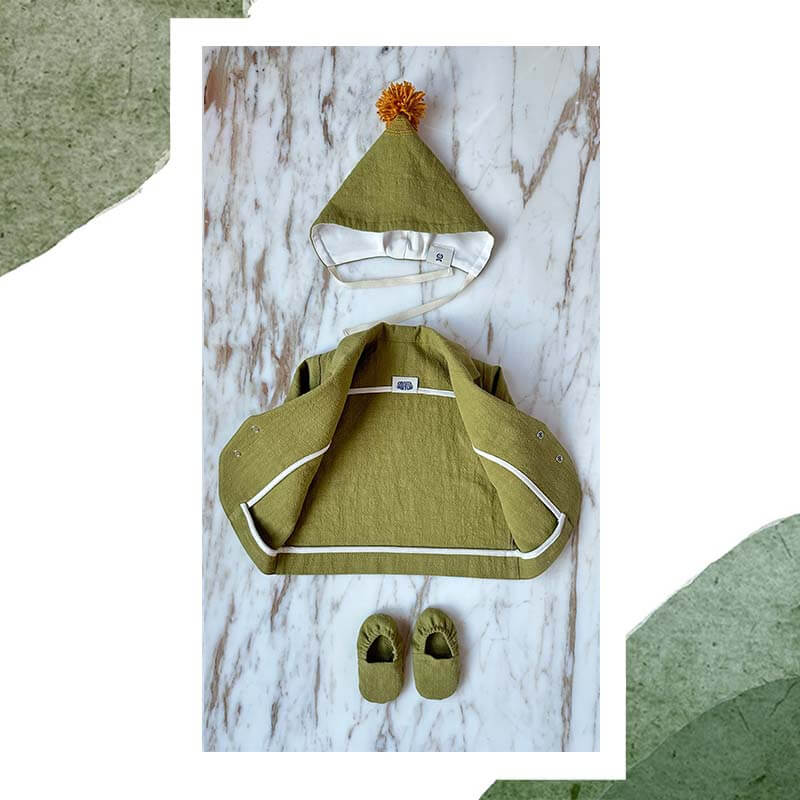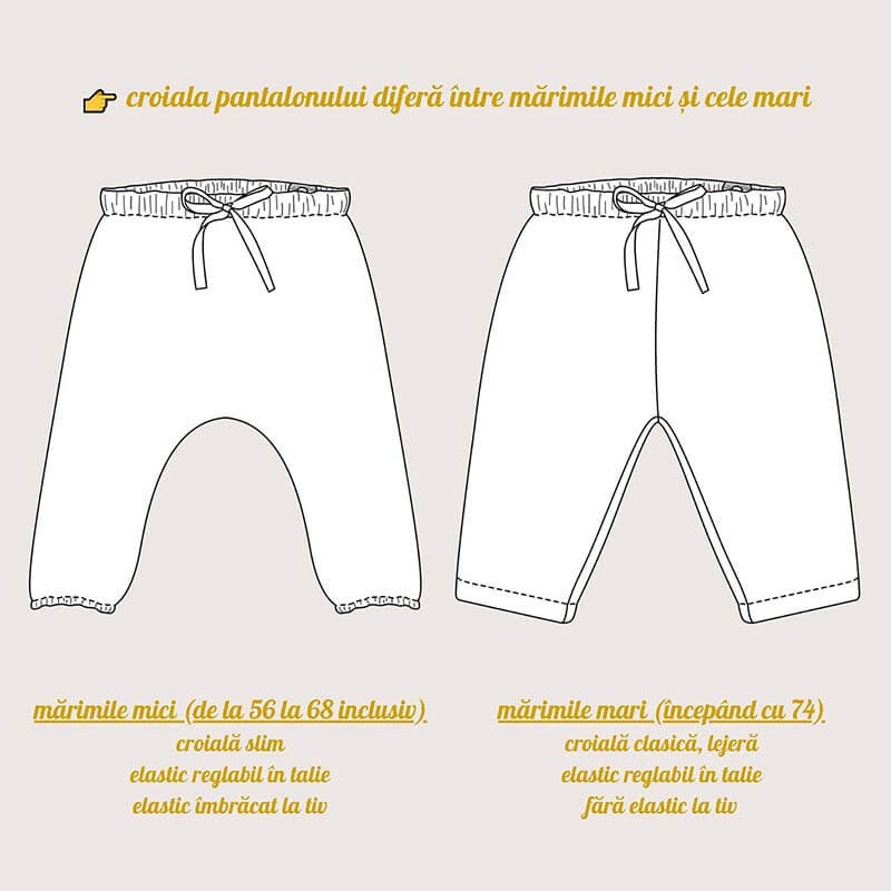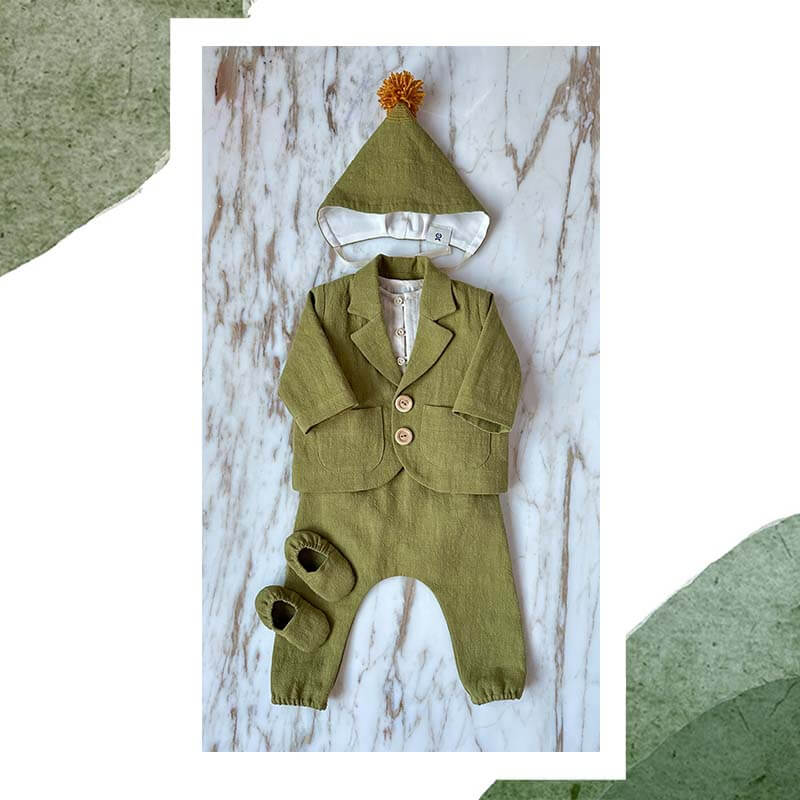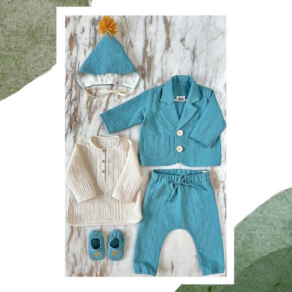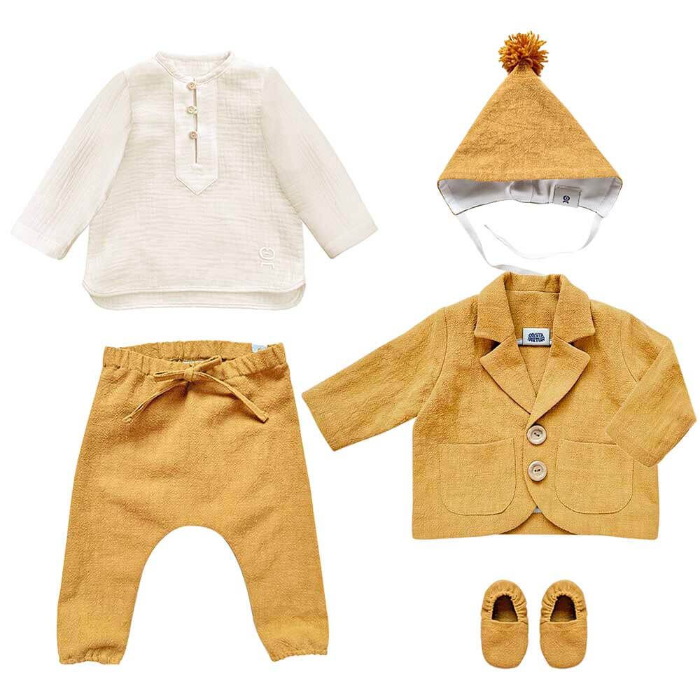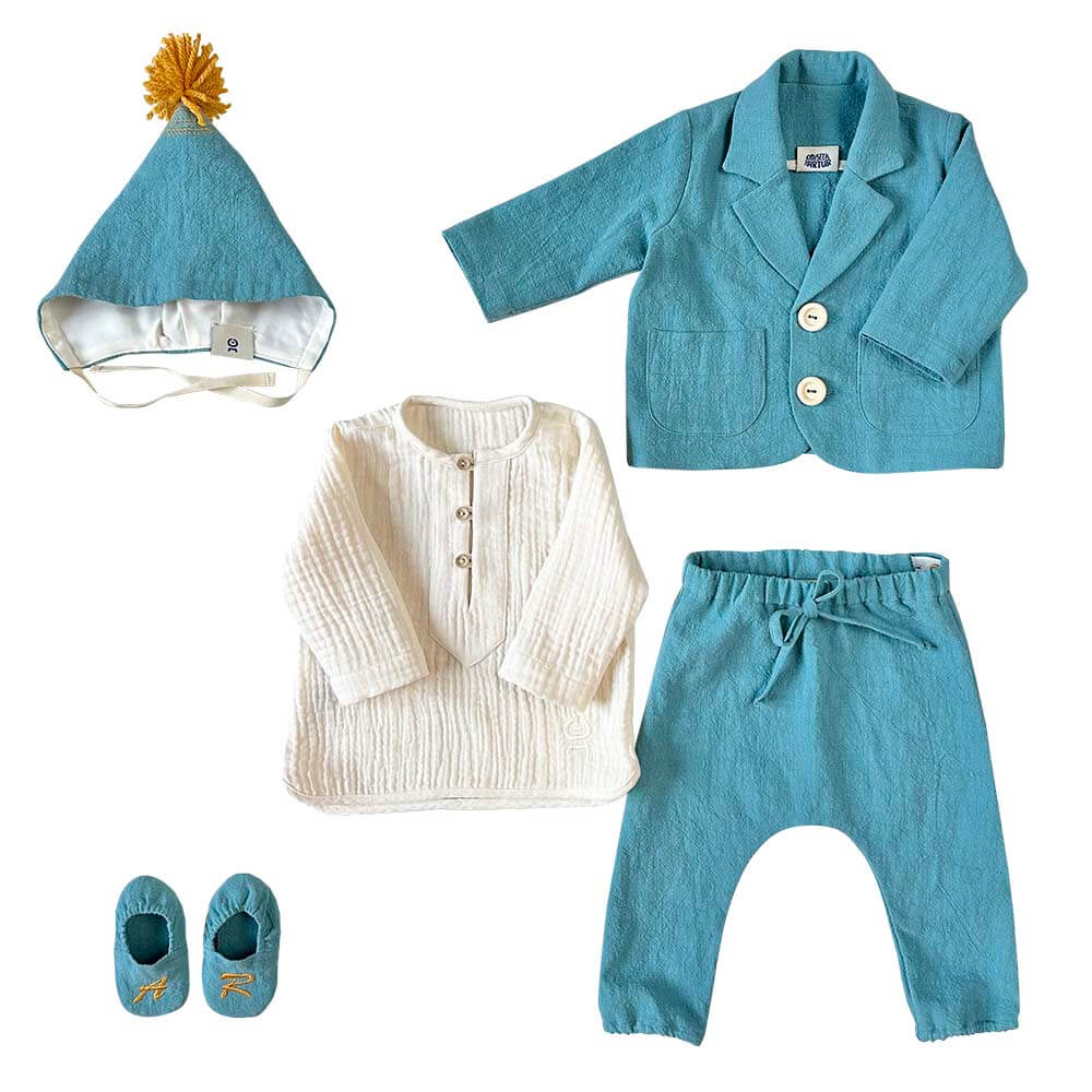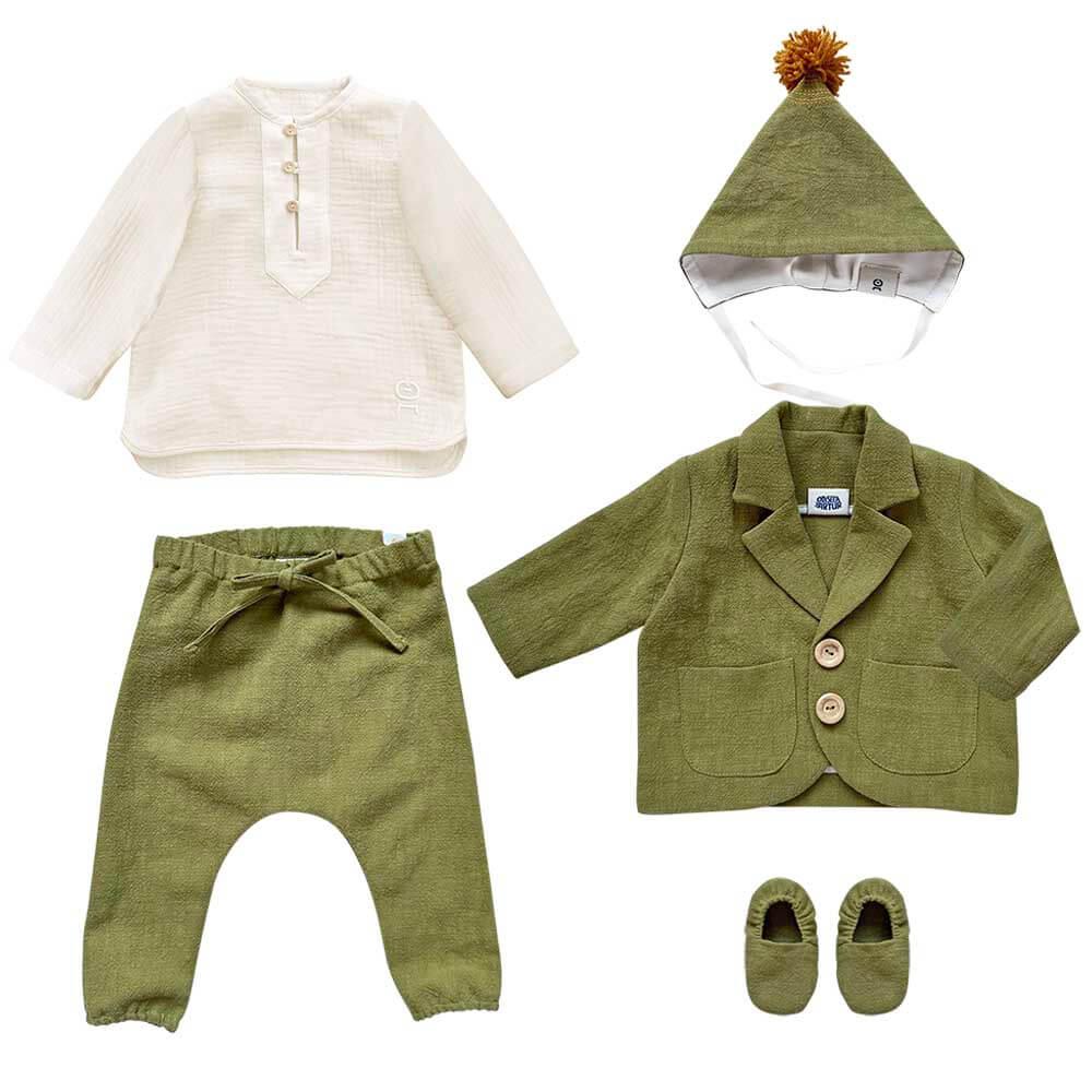 Set elegant compus din sacou, cămașă, botoșei, căciuliță cu pompon și pantaloni din in. Cămașă cu mânecă lungă, cu decolteu rotund și nasturi de lemn, mai scurtă în față și lungă la spate. Pantaloni lungi cu șnur decorativ și elastic reglabil îmbrăcat în talie. Sacou necăptușit cu nasturi din lemn natur și buzunare la față.
