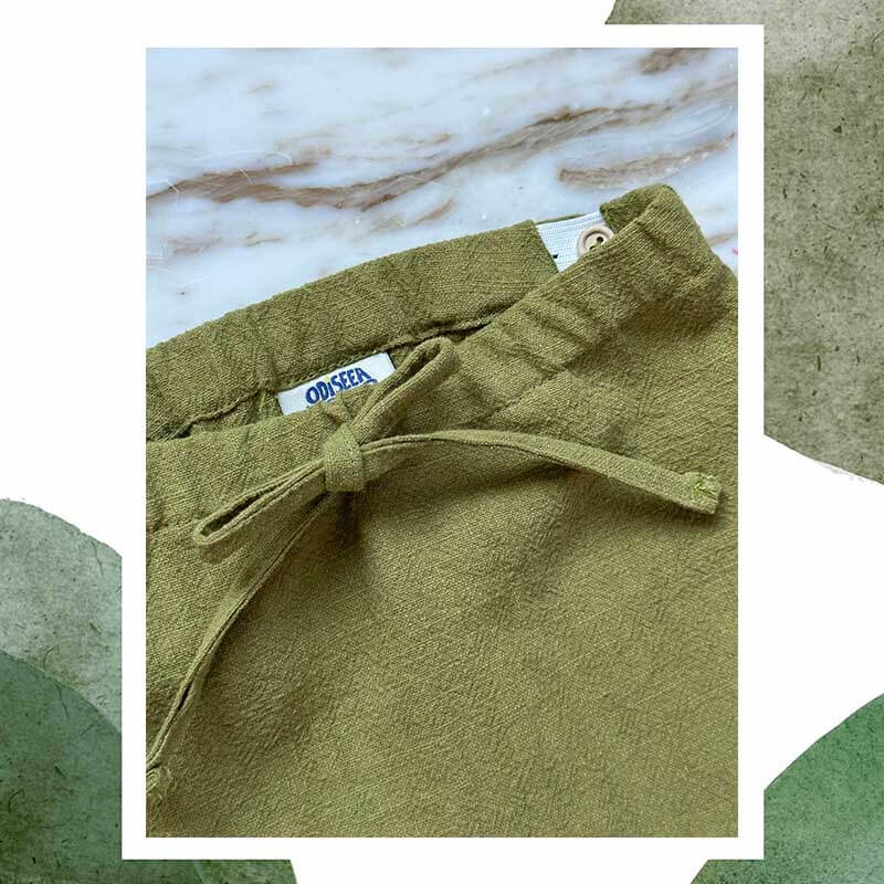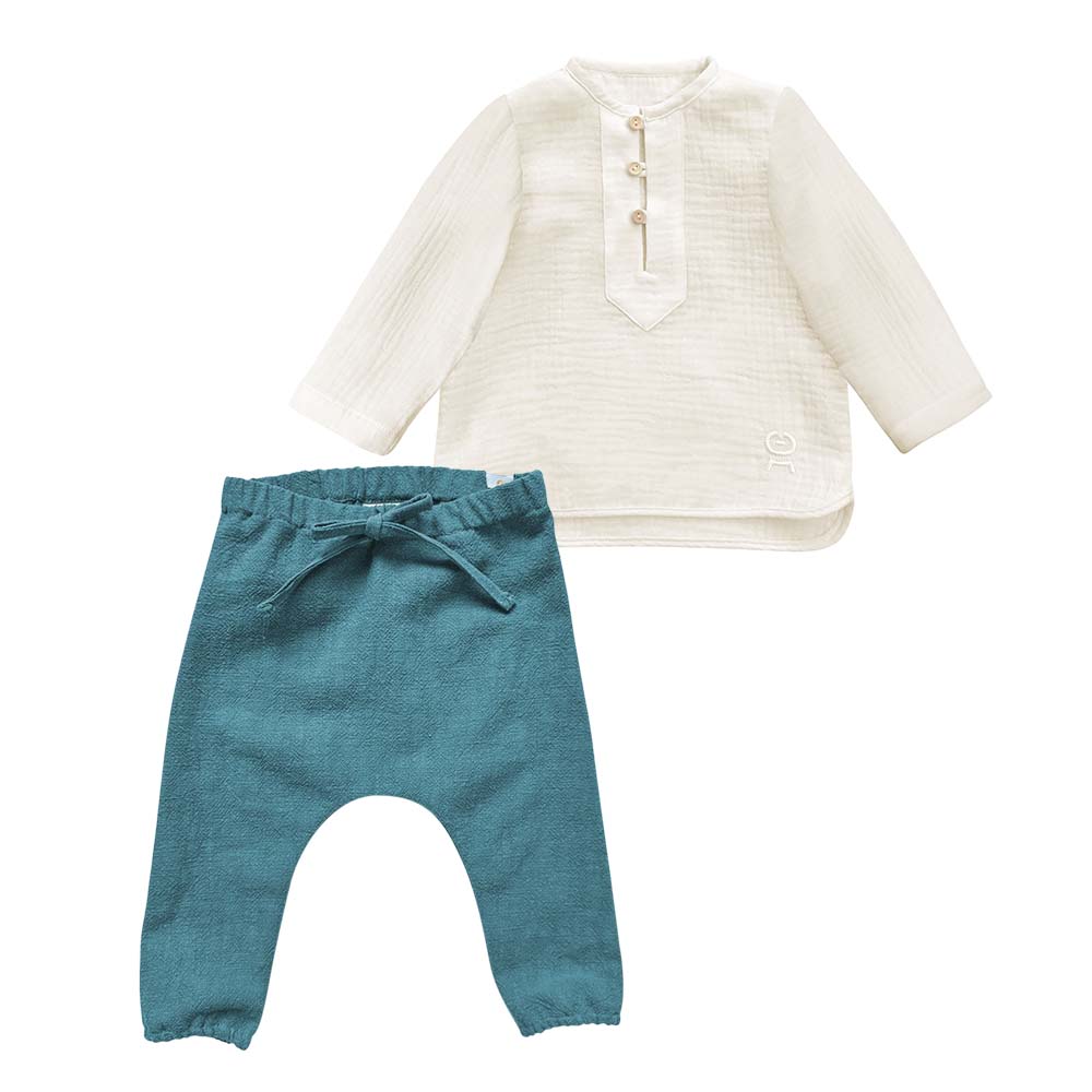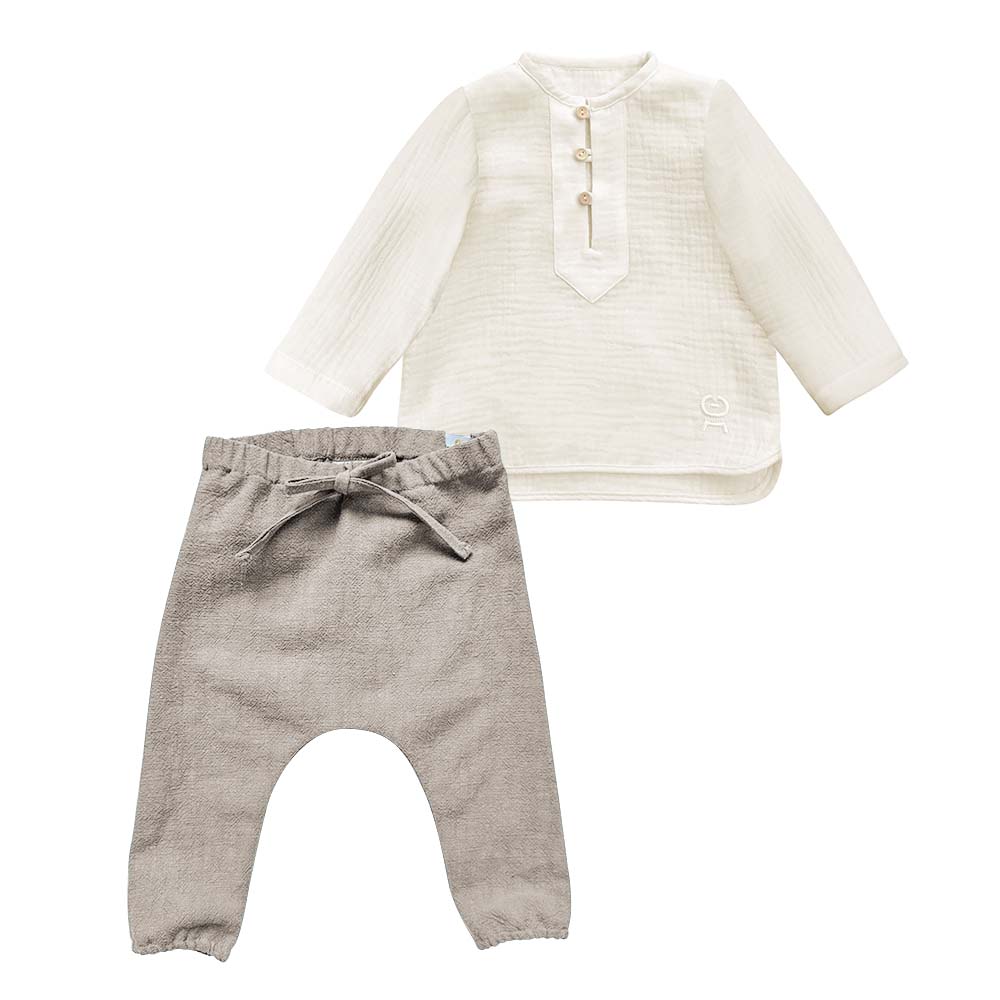 Set comod și elegant compus din cămașă din muselină cu croiul lejer și pantaloni din in. Cămașă cu mânecă lungă, cu decolteu rotund și nasturi de lemn, mai scurtă în față și lungă la spate. Pantaloni lungi cu șnur decorativ și elastic reglabil îmbrăcat în talie.