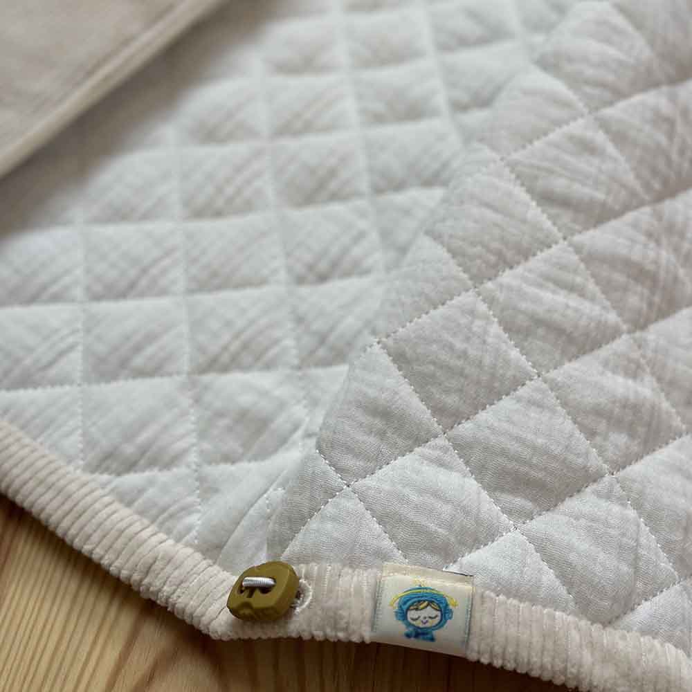 strat exterior 97% bumbac , 3% elastan, astfel devine elastic, oferind un nivel suplimentar de confort și libertate de mișcare; strat interior 100% bumbac (muselină); umplutură 100% poliester